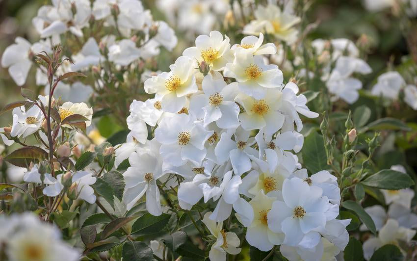 Light, airy and effortlessly graceful, Kew Gardens™ is a charming English shrub rose that captures the gentle spirit of an English meadow. Bred in honour of the Royal Botanic Gardens, it produces clouds of small, single white blooms, each touched with a soft hint of apricot at the centre.Flowering freely throughout the season, the blooms appear in generous clusters against mid-green foliage, creating a luminous effect in the garden. Its almost thornless stems make it especially suited to pathways or borders, where ease and elegance go hand in hand.